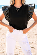 Black Leather Ruffle Sleeve Patchwork Round Neck Blouse