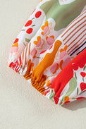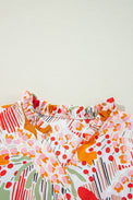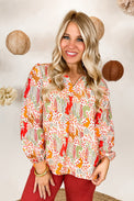 Orange Printed Split V Neck Puff Sleeve Blouse