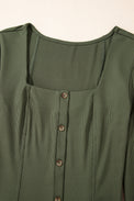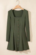 Guacamole Green Rib Knit Square Neck Buttoned Long Sleeve Mini Dress