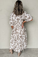Khaki Floral Puff Sleeve V Neck Buttoned Front Maxi Dress