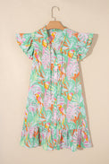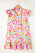 Pink Abstract Floral Ruffle Trim Flutter Sleeve Buttoned Dress
