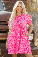 Rose Leopard Puff Sleeve Tie Front High Waist Mini Dress