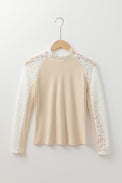 Beige Floral Lace Patchwork Long Sleeve High Neck Slim Top
