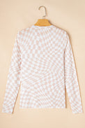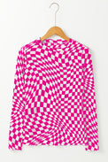 Black Checkered Pattern Mesh Mock Neck Long Sleeve Top