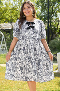 Black Floral Print Bow Detail Puff Sleeve Plus Size Midi Dress