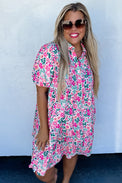 Pink Plus Size Floral Half Button Short Puff Sleeve A-line Dress