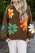 Coffee Big Flower Pattern V Neck Drop Shoulder Sweater