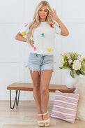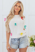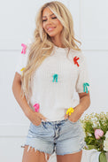White Colorful Bow Knit Mock Neck Short Sleeve Sweater