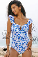 Blue Floral Ruffled Strap Lace-up Hollow Out One Piece Swimsuit