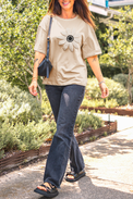 - Relaxed casual tee features a unique contrast crochet floral graphic for a bohemian vibe.