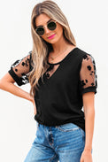 Black t shirt with mesh puff sleeve is flattering and elegant.