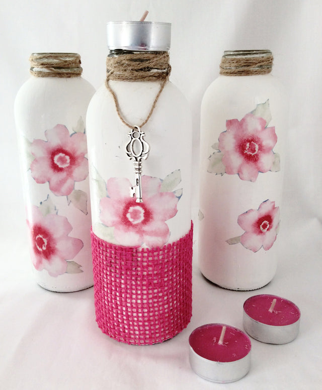Shabby Chic Glass Bottle Vases with Pink Burlap & Silver Skeleton Key, Set of 3