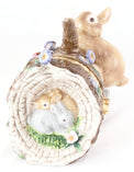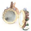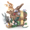 Beautiful Large china hinged trinket box with Bunny rabbits on log with flowers and Easter eggs by CWC.