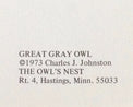Great Gray Owl by Charles J. Johnson, Vintage Notecard 1973, The Owl's Nest