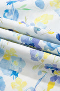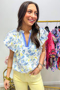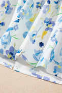 Sky Blue Floral Print Frilled Notched V Neck Blouse