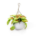 Displayed in a white pot, this handmade dollhouse miniature features green leaves with red and brown accents that drape over the edges of this hanging basket. Complete with a silver wire hanger, this mini accessory can be hung from a dollhouse ceiling or front porch. This miniature is also great for creating dioramas.