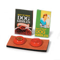 Timeless Minis miniature dog food station includes brown mat with attached red food bowls, and two dog food bags.