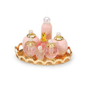 Timeless Minis miniature gold vanity tray with assorted size pink bottles. 1.5 inches.