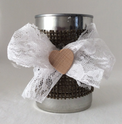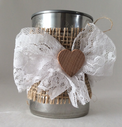 Tin Can has been handwrapped with Burlap, Lace and have a added a small wood Heart to center of bow.