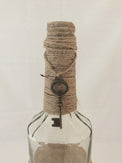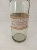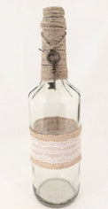 Clear wine bottle decorated with twine and burlap with lace added a skeleton for that final touch!