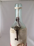 Paper flowers and 2 skeleton keys hanging from the bottle neck.