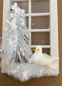Snow covered Pine tree with Silver ornaments sits on the Window sill.